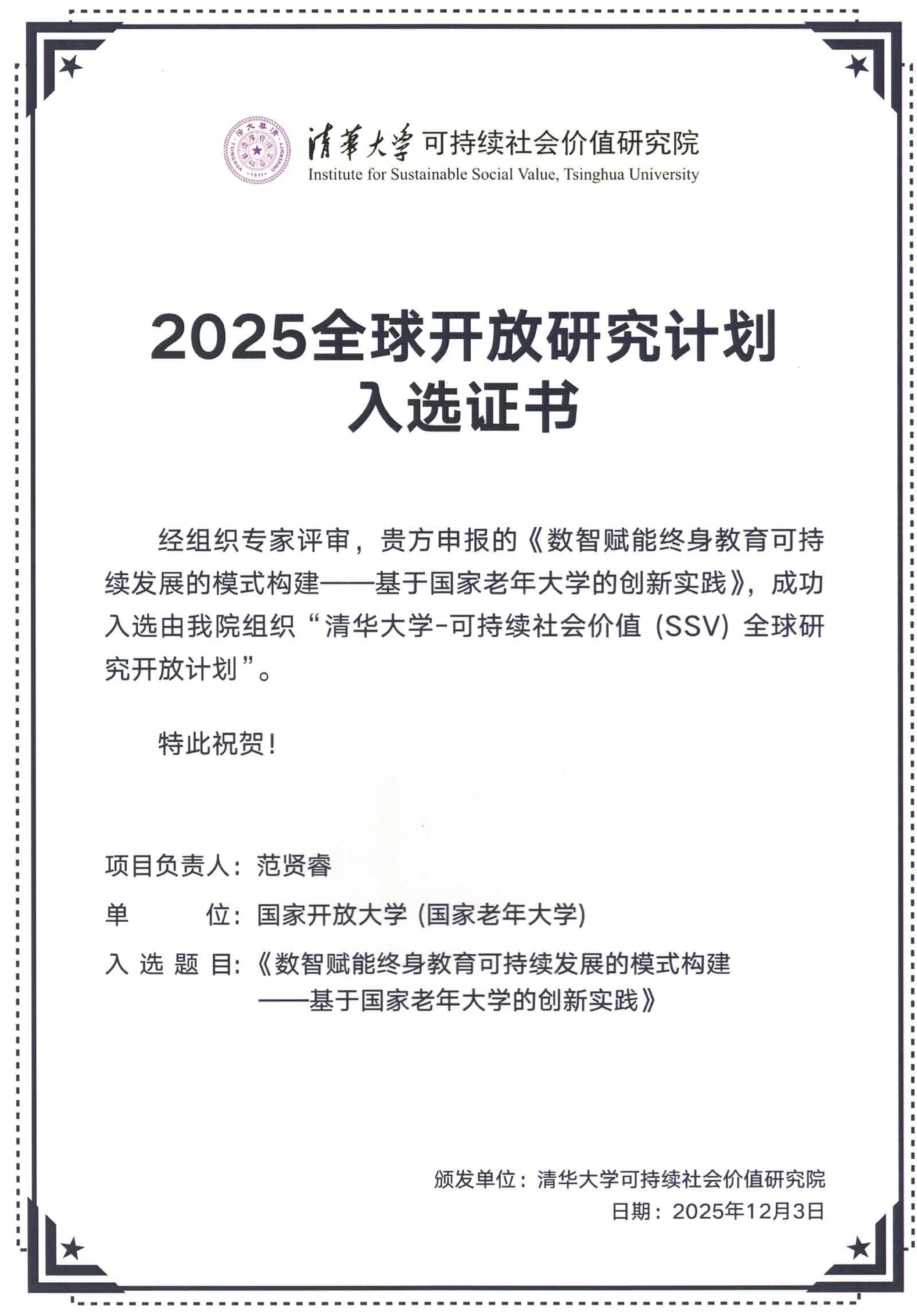 12月3日,在2025可持续社会价值创新大会上,清华大学可持续社会价值研究院公布“可持续社会价值全球开放研究计划”2025年度入选项目名单,国家开放大学(国家老年大学)“数智赋能终身教育可持续发展的模式构建——基于国家老年大学的创新实践”课题,从174份有效课题申请中脱颖而出,成为首届入选项目之一。